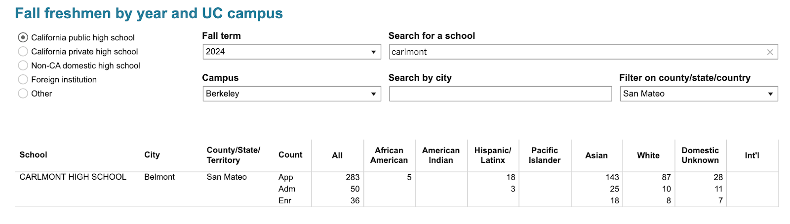 First, take a look at Carlmont’s admissions data to Berkeley, one of the most competitive UCs: