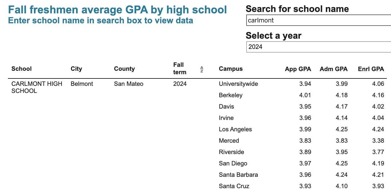 - Berkeley and UCLA admit GPAs for Carlmont students are above 4.1+ weighted.