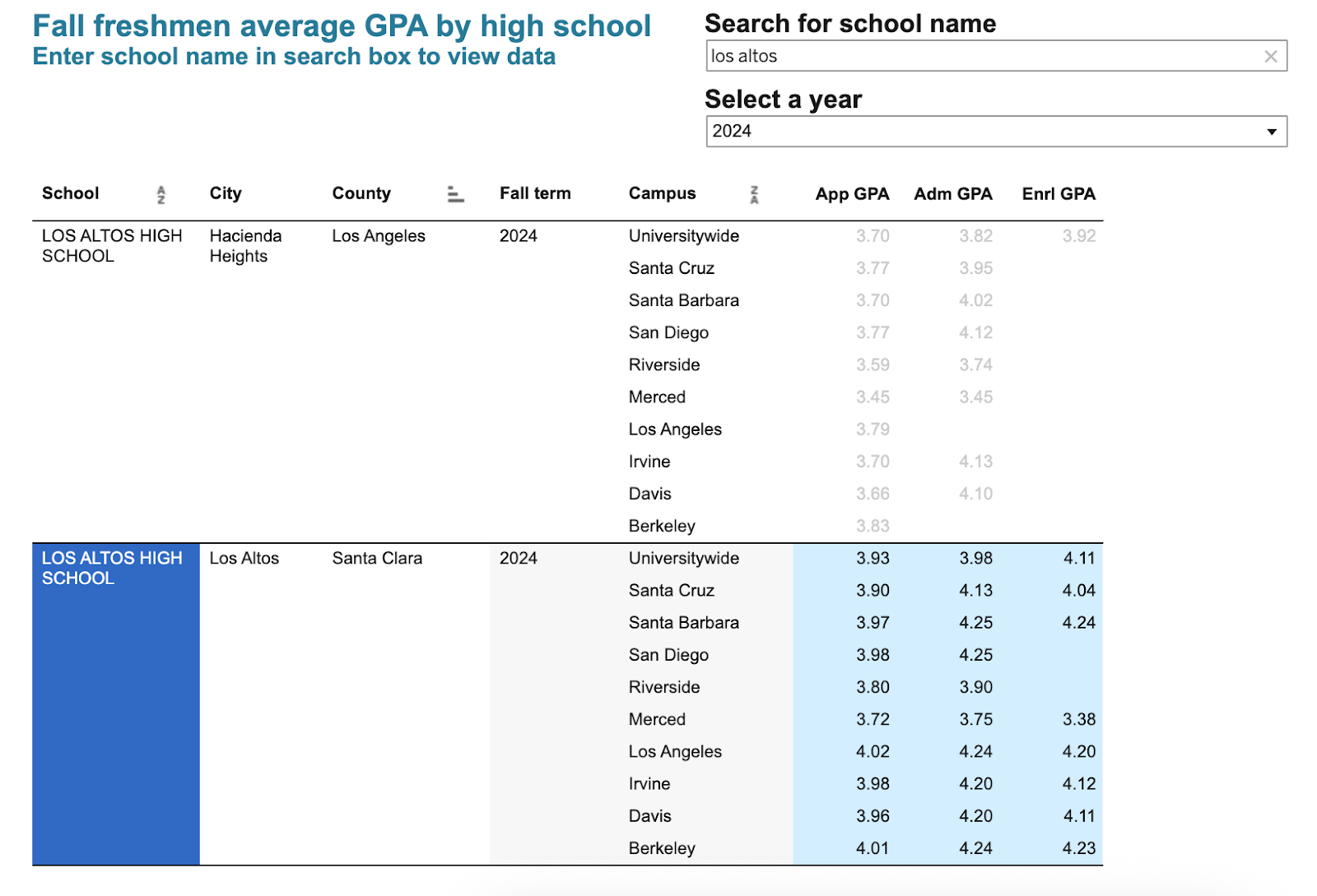 On the GPA side, the UC “average GPA by high school” dashboard shows GPA for Los Altos, including average applicant GPA, admitted GPA, and enrolled GPA: