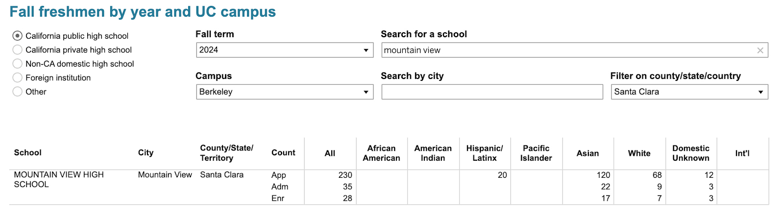 For Fall 2024 applications from Mountain View, UC Berkeley reports: 230 applicants, 35 admits, and 28 enrollees.