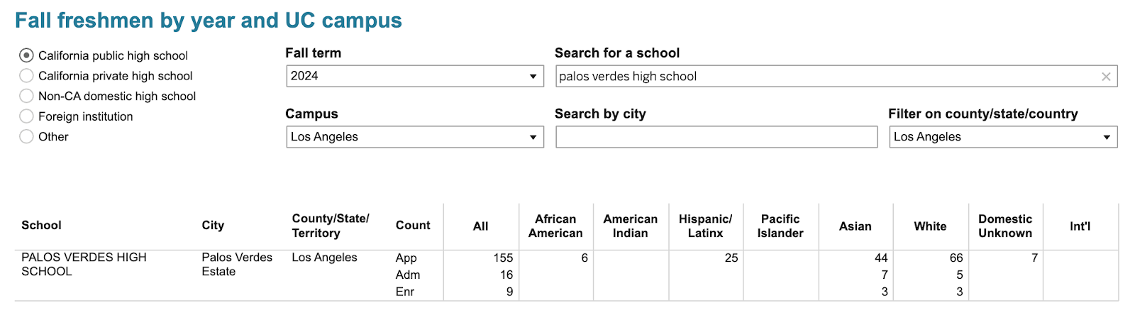 155 PVHS students applied to UCLA, 16 were admitted, and 9 enrolled. That’s an admit rate of about 10.3%, which is about a percentage point higher than UCLA’s overall acceptance rate. This isn’t surprising, since Palos Verdes is so well-respected and admissions officers are generally willing to admit deeper into the class than they are at less competitive high schools.