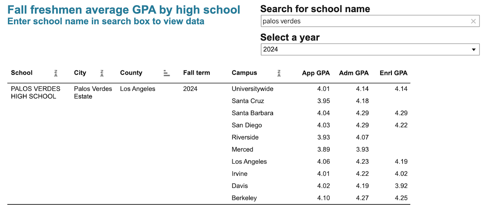 The UC also releases weighted GPA data for each UC campus. Take a look at Palos Verdes’s data for 2024: