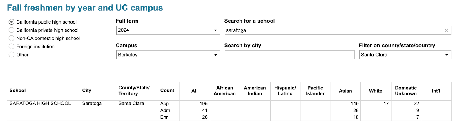 That makes Saratoga’s 2024 Berkeley admit rate about 21%, which is a huge jump from the overall admit rate of about 12%. This discrepancy might indicate that Berkeley admissions officers are willing to go “deeper” into the class at Saratoga versus other high schools, which means that they may be willing to admit a larger percentage of Saratoga students, not just the top 5-10%. Does that mean they’re more likely to admit someone with a 3.5 GPA? Probably not. But if you’re one of 20 students who has a weighted 4.1 GPA, you may be more likely to be in the running.
